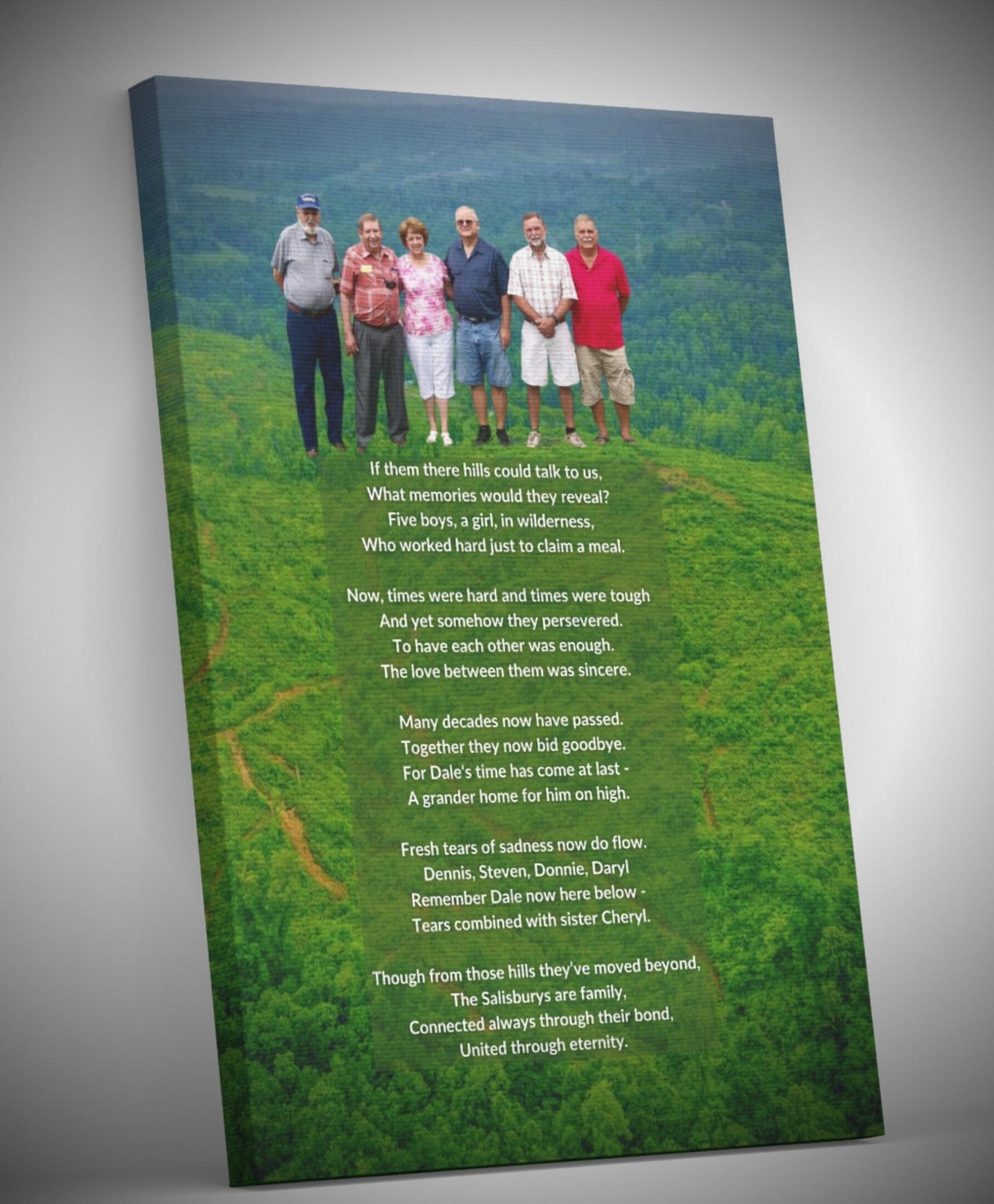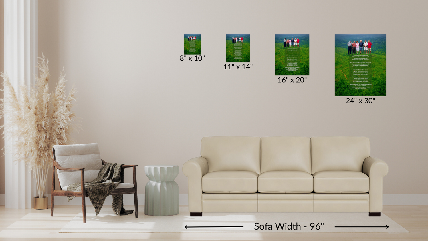 Your print will be a stretch-mounted image wrap. This means your print will be mounted over 1.5” thick genuine wood stretcher bars with your combined photo and personalized poem image wrapping on the sides with a fraction of an inch around the back.