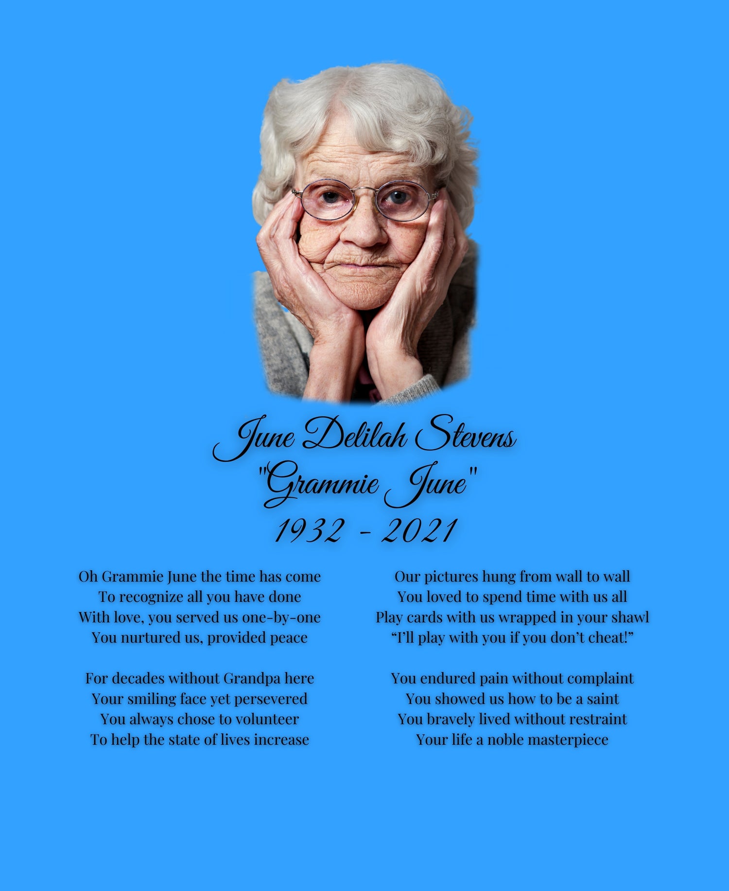 Whose life can we help you memorialize and celebrate forevermore? Whether you choose a poem, digital print, or canvas print, we will collaborate with you to create something special and treasured.